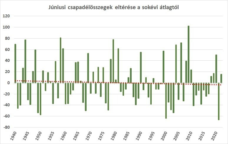 A mellékelt ábra egy 1940 óta jegyzett, homogenizált csapadéksort mutat be Veszprém térségére. Jól megfigyelhető egyes évek kiugró vagy éppen szélsőségesen kevés csapadéka, mint például a tavalyi június, amikor 66 milliméterrel kevesebb esett a sokévi átlagnál, ami 70 milliméter.