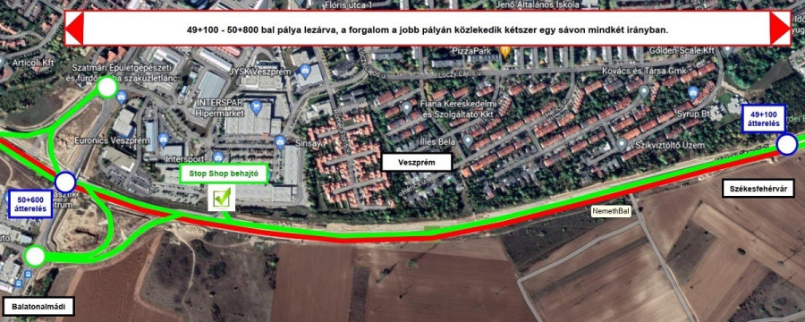 Ezúton tájékoztatjuk a kedves lakosságot, hogy a 8. számú főút, Veszprém déli elkerülő I. ütemének építésénél 2022. július 13-tól a 8. sz. főút 49+100 és 50+600-as szelvényei között lezárásra kerül a bal pálya, a forgalom már az elkészült jobb pályán fog haladni ezen a szakaszon. Az átterelések a 49+100 és 50+600-as szelvényekben lesznek kialakítva. A Stop Shop bevásárlóközpontnál is megnyílik a behajtási lehetőség a 8. sz. főút irányából a végleges forgalomtechnikának megfelelően. A bevásárlóközpontból a közvetlen kihajtás a 8. sz. főútra megszűnik, a jövőben az Almádi csomóponton keresztül lehet kihajtani a 8. sz. főútra.