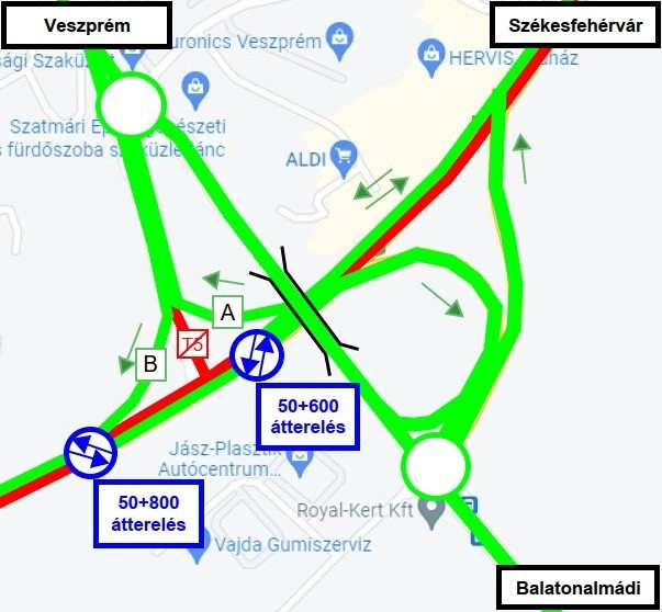 Az Almádi csomópontban a már korábban megnyitott B-ág mellett az A-ág (Székesfehérvár-Veszprém) is a végleges formájában fog üzemelni ebben a terelési fázisban, az eddig használt T5 jelű terelőút pedig elbontásra kerül.
