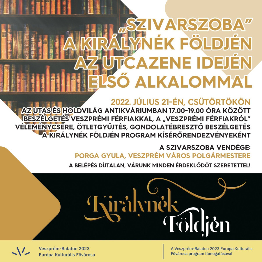 Éppen ezért minden nyilvános rendezvényük – jelen esetben az Utcazenés játszóház – mellett állandó kísérőrendezvényként úgynevezett „szivarszobát” szerveznek, kifejezetten a veszprémi férfiak számára. Ezeken az eseményeken különböző férfiakat érintő közéleti, kulturális, adott esetben sporttal kapcsolatos témák köré szervezett programokat tartanak. A „szivarszoba” programsorozat az Utcazenén fog debütálni, július 21-én, csütörtökön az Utas és Holdvilág Antikváriumban délután 5 órától este 7-ig. Itt a Királynék Földjén program fővédnöke, Porga Gyula polgármester várja majd az érdeklődő férfiakat egy nyitott, őszinte beszélgetésre Veszprémről, a veszprémi férfiakról, lehetőségekről, közös feladatokról.