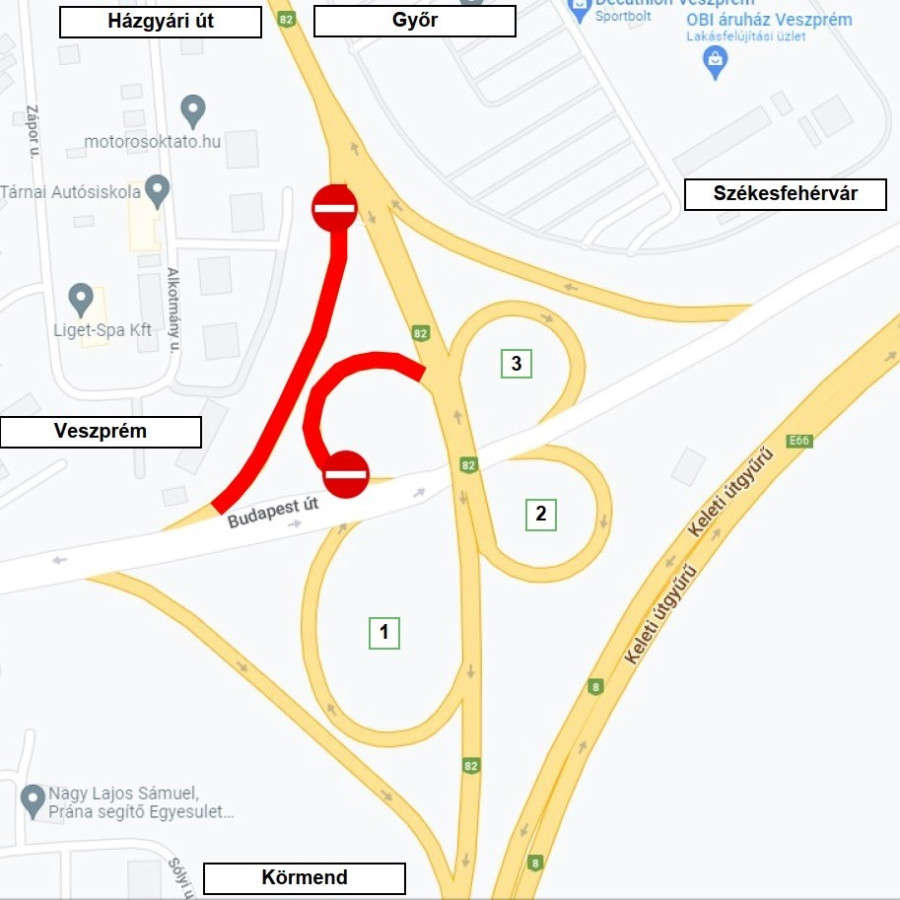 Az alábbi ábrán látható módon lezárják július 25-én, hétfőn a régi Budapest úti csomópont Győr felől Veszprém felé vezető ágát. A 82-es útról vagy a Házgyári útról érkezők úgy tudnak a Budapest útra eljutni, hogy a csomópontban előbb a székesfehérvári ágon (1) kell lehajtani, majd fel a Győr felé vezető ágon (2), és a felüljárót követően lehet a belváros felé (3) fordulni.