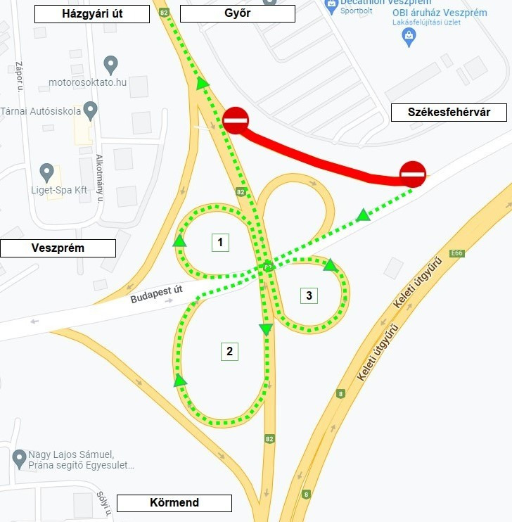 Az 1. sz. ábrának megfelelően lezárják a pirossal jelölt csomóponti ágat. A Székesfehérvár felől érkezők a csomópont többi ágát (a térképen jelölt sorrendben) felhasználva érhetik el Győr irányába haladva a Házgyári utat és a 82-es számú főutat.