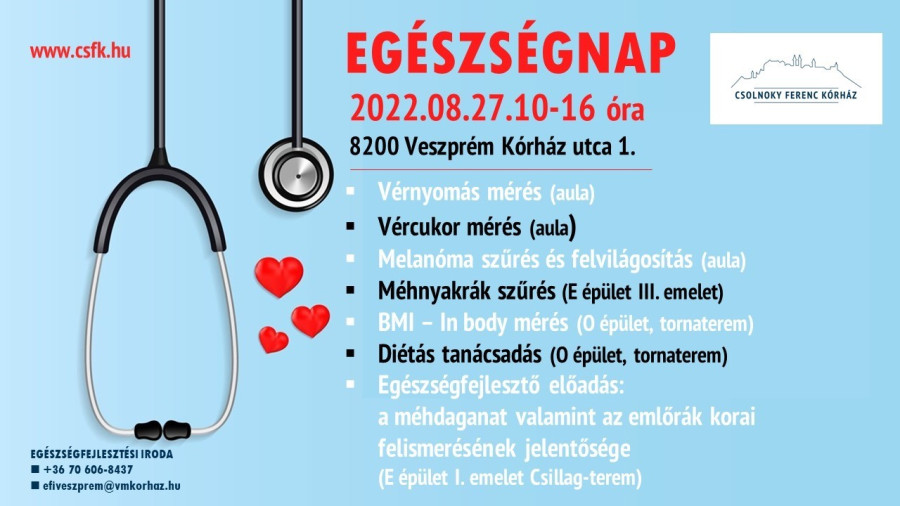 Az "Egészségnap" programja elérhető a kórház honlapján: https://csfk.hu/hirek-aktualitasok/egeszsegnap-a-csolnoky-ferenc-korhazban/