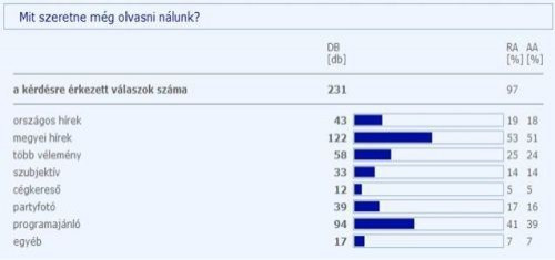 A válaszadók zöme a portálunk városi jellege ellenére megyei híreket is szeretne olvasni nálunk, ugyancsak sokan szavaztak a programajánlóra.