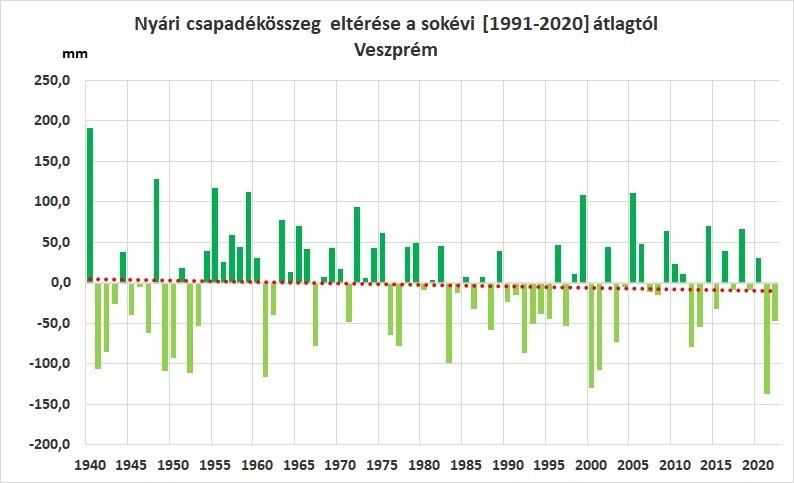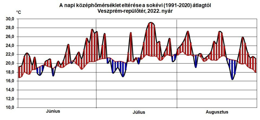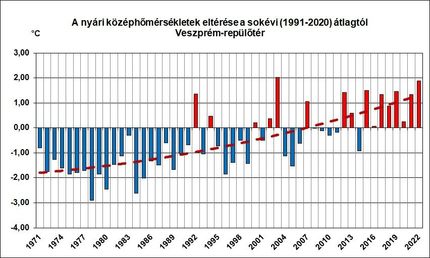 2022 nyara a Veszprém-repülőtéri meteorológiai állomás adatai alapján 1,9 C-fokkal volt melegebb az úgynevezett sokévi átlagnál (az 1991 – 2020 közötti 30 év átlaga), ezzel a második legmelegebb nyár lett térségünkben. Június végétől időjárásunkat a gyakori hőhullámok jellemezték, de a június is jóval melegebb volt az átlagnál. A tavalyi rendkívüli száraz nyarat idén is csapadékhiányos követte, a nyári csapadékösszeg ismét elmaradt az átlagtól, tovább folytatódott a súlyos aszály.