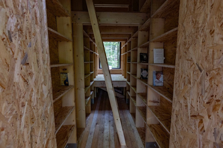 Ugyanis azon kívül, hogy a kunyhó belsejében 6 egyszerű fekvőhely is ki van alakítva, másfél emelet magasságban könyvespolcok sorakoznak egymás mellett, mindez az erdő mélyén.
