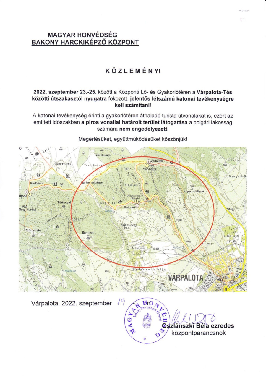 Korlátozással járó katonai gyakorlat szeptember 23-25. között Tés és Várpalota között