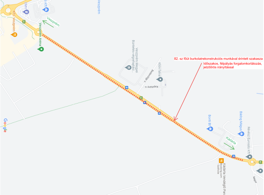 Ennek során a megjelölt időpontig félpályás, váltakozó irányú jelzőőrös forgalomterelésekre kell majd számítani a 82. sz. főút Veszprém TESCO és a Veszprém – Kádárta körforgalomi csomópontok között. A munkálatok, illetve útlezárások miatti esetleges kellemetlenségekért elnézést kérünk.