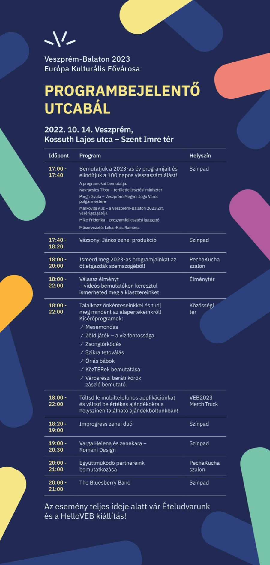 17 órától a színpadon Navracsics Tibor területfejlesztésért felelős miniszter, Porga Gyula Veszprém, megyei jogú város polgármestere, Markovits Alíz, a Veszprém-Balaton 2023 Zrt. vezérigazgatója, valamint Mike Friderika programfejlesztési igazgató mutatja be a 2023-as év programjait, az Európa Kulturális Fővárosa címben rejlő lehetőségeket.