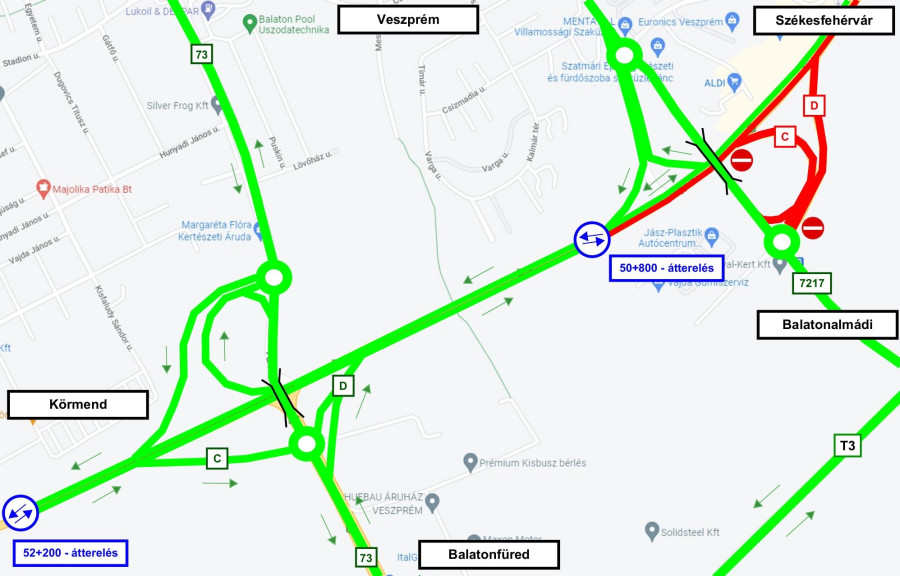 pedig a T3 jelű összekötőút- füredi csomópont D ága a javasolt irány. A nyolcas főúton az 50+800 és az 52+200