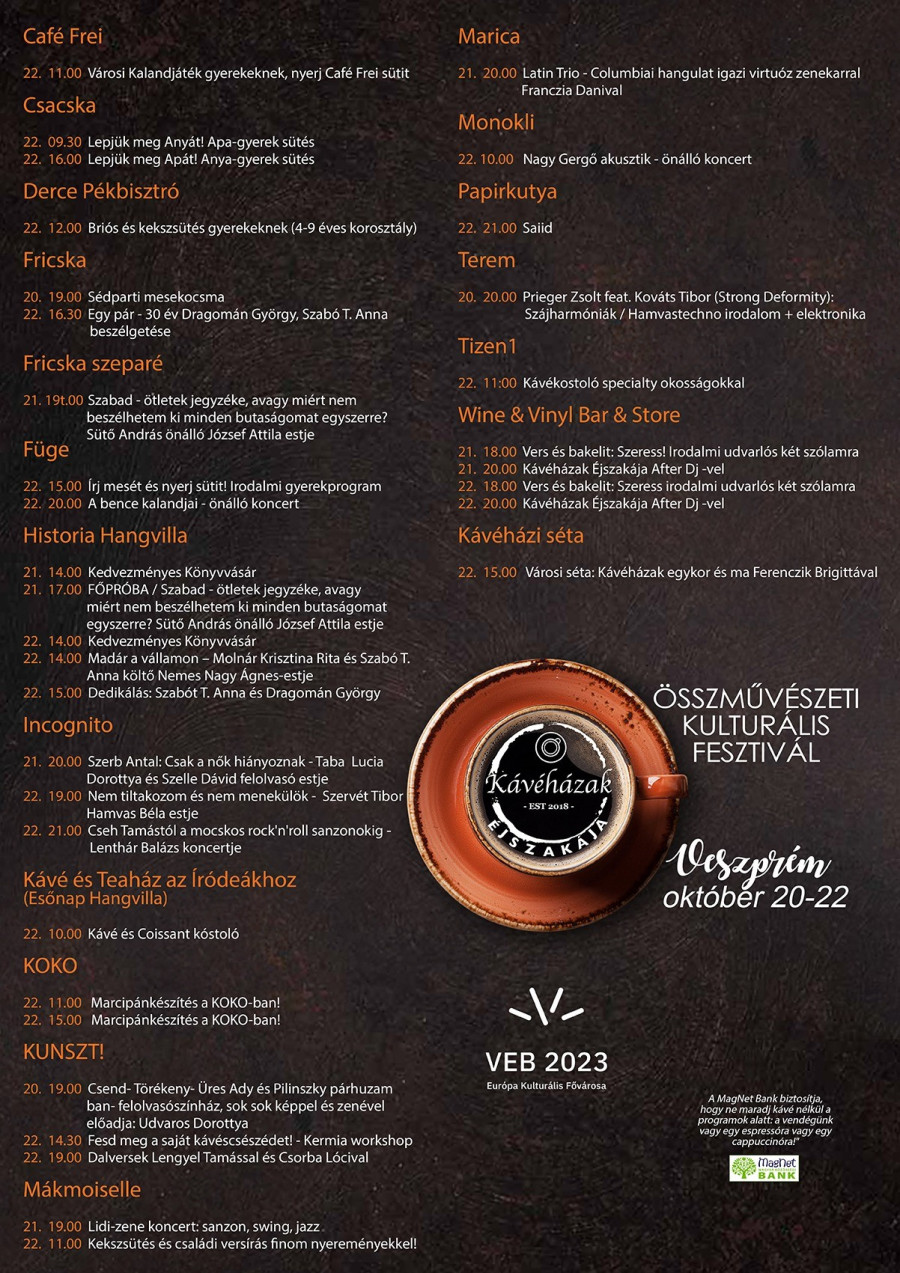 Idén ezt folytatva Veszprémben 18 helyszínen körülbelül 40 programmal várják az érdeklődőket október 20-22 között, amelyek közt irodalmi és zenés események is megtalálhatók. A részletes programok között lejjebb görgetve lehet tájékozódni, de a szervezők felhívják a figyelmet arra, hogy a nagy érdeklődésre való tekintettel folyamatosan fogynak a helyek, így érdemes időben regisztrálni, vagy a helyszíneken érdeklődni a létszámról.