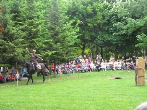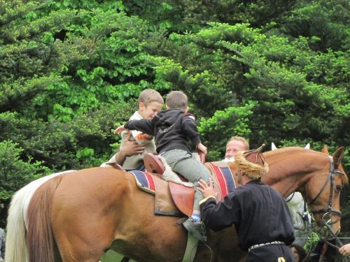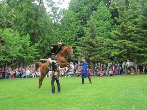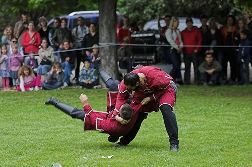 ...majd ősi népi játékok bemutatása következett. Elsőként pártarablás, amely során az eladó hajadon kilovagolt a leggyorsabb lovon, és amelyik kérő utolérte, és kikapta a hajából a pártáját, annak lett a felesége.