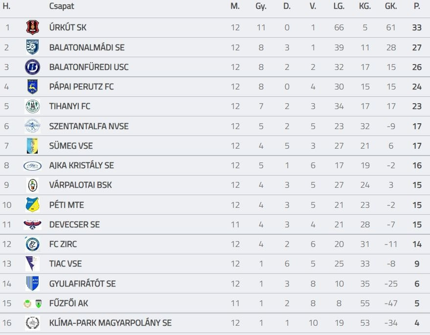 A Veszprém megyei I. osztályú labdarúgó-bajnokság tizenkettedik fordulóját rendezték hétvégén. Az listavezető Úrkút könnyedén nyert a vendég Fűzfő ellen (10-0), míg a Tihany leikszelt a házigazda Sümeggel (1-1). A Zircnek sikerült nyernie a Várpalota otthonában (2-4), ahogy a Devecsernek is Péten (2-3).