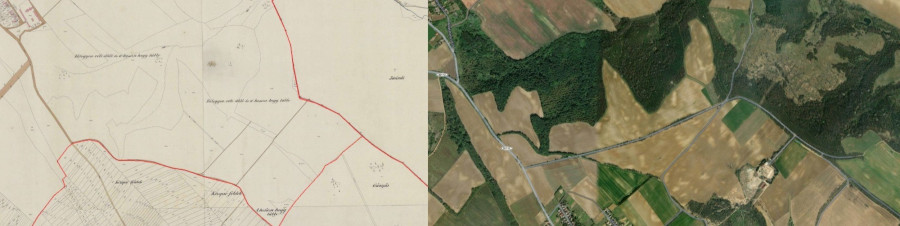 Az egyik ilyen egy Dudar melletti erdős részen látható, ahol az 1857-es rajz is jól mutatja, hogy hol húzódott az erdő sávja és honnan indultak a szántók. 170 év ide, vagy oda, ennek a vonala a mai napig ugyanaz, mint a 19. században.