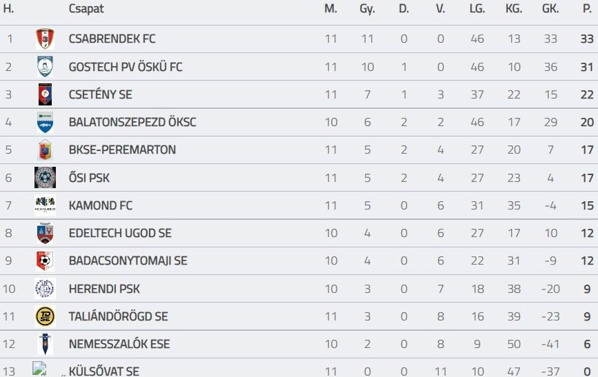 A Peremarton 4-1-re múlta felül a Külsővatot, az Öskü szintén szép sikert aratott a Nemesszalók vendégeként (0-2). AZ Ősi kontra Kamond derbin utóbbi örülhetett (2-3), a Taliándörögd pedig sima diadalt aratott hazai pályán a Herenddel szemben (3-0).
