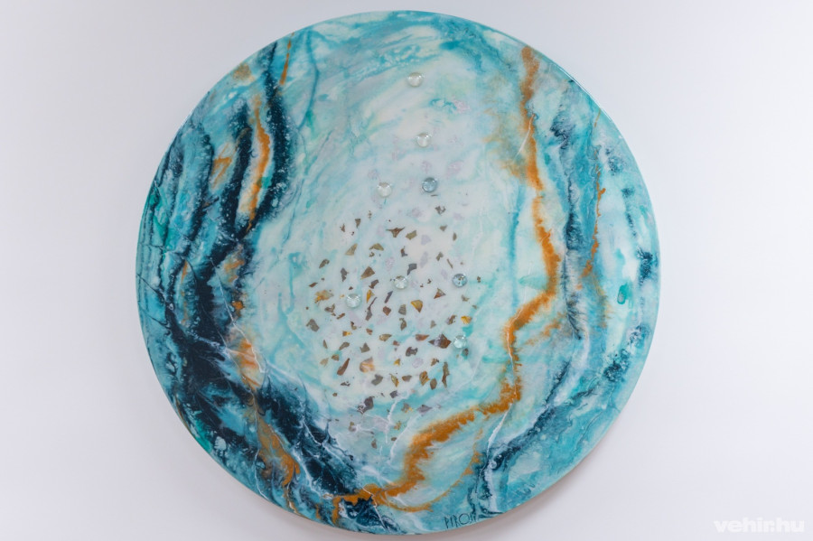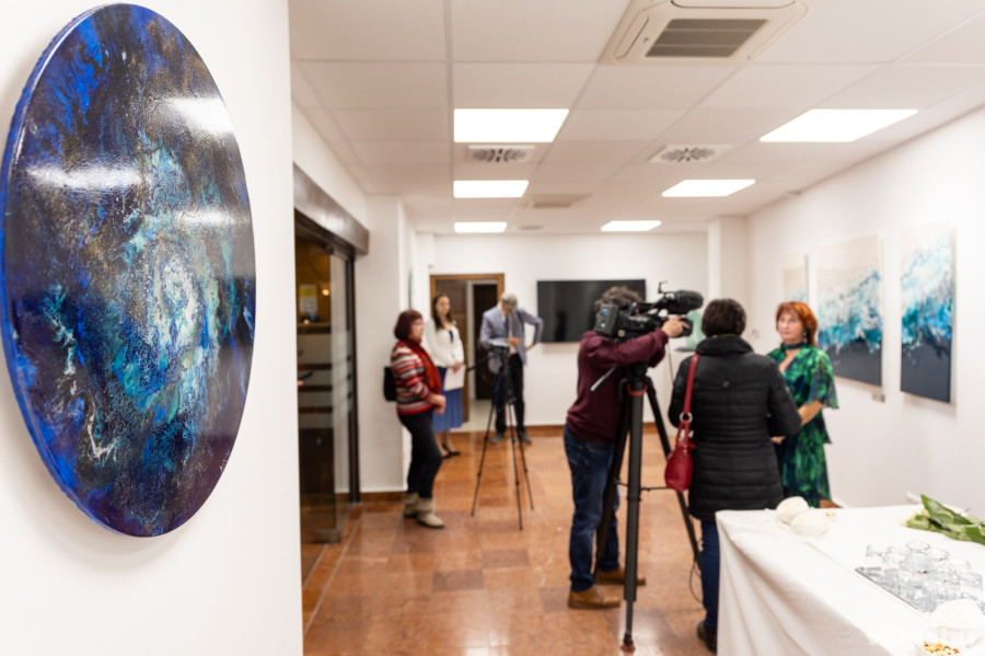 A művésznő a teremavatón elmondta, az epoxi gyantával készült képeket kifejezetten az alkalomra készítette, hogy a ragyogó színű képek pótolják a természetes fény hiányát és üdeséget kölcsönözzenek a komoly tárgyalóteremnek – ehhez ez az anyag kifejezetten jó, hiszen nem sárgul és nem mattul az idővel.