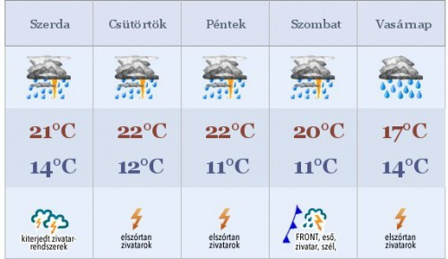 Szerdán napközben többfelé számíthatunk csapadékra, helyenként - főleg a középső és északi országrészben - akár hevesebb zivatarok is előfordulhatnak, melyeket felhőszakadás, nagyobb méretű jég és viharos széllökések is kísérhetnek. A hajnali órákban 11-14, míg napközben 18-24°C körül alakulnak a hőmérsékletek.