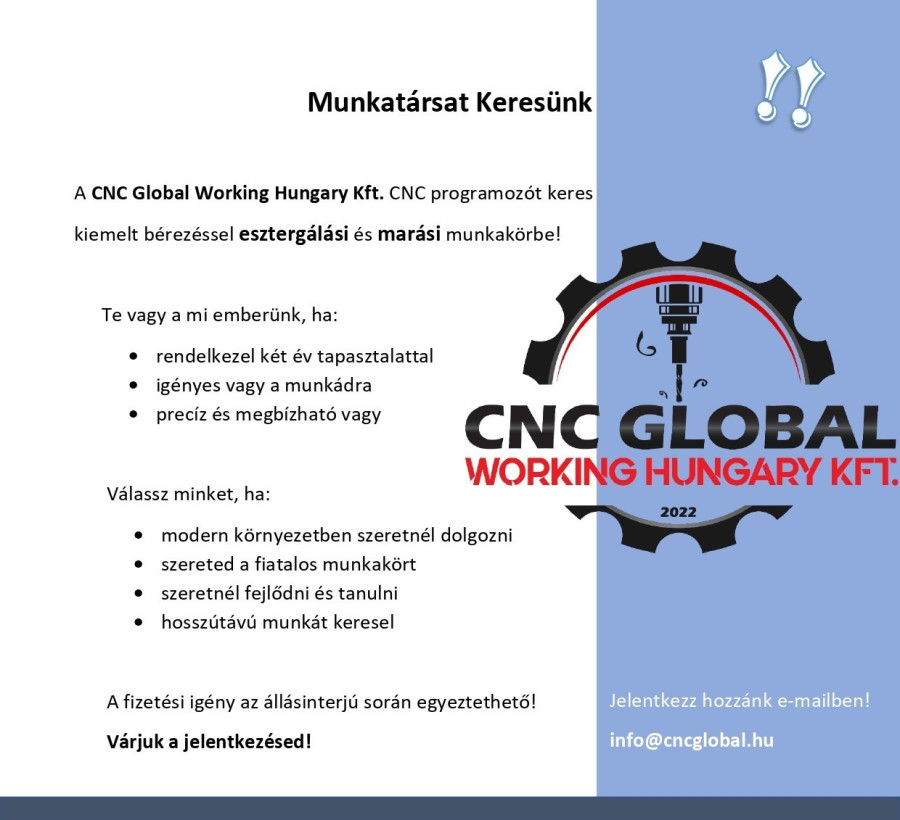 Munkatársat keres a CNC Global Working Hungary Kft.