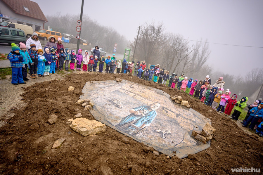Az alkotás helyszíne sem véletlen, ugyanis annak idején a Jeruzsálemhegyen került a felszínre a lelet, ebben annak is nagy szerepe volt, hogy Veszprém ezen városrészében több kőbáanya is működött, hogy kiszolgálja a városi építkezések alapanyagigényét. Erről Bontó László, helytörténész beszélt a pénteki eseményen, aki még egy titkot elárult a kavicsfogú álteknős leletének megtalálálásáról, miszerint arra valójában a kőbánya dolgozói leltek rá, Laczkó Dezső ezek után azonosította a kövületet.