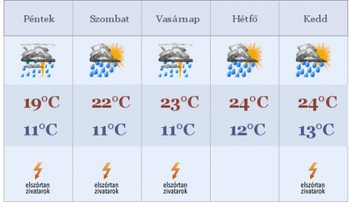 Pénteken napközben kevés napsütés várható, a megnövekvő felhőzetből többfelé fordulhat elő zápor, zivatar - utóbbiakat jégeső, felhőszakadás is kísérheti. A hőmérséklet 16 és 21 fok között alakul.