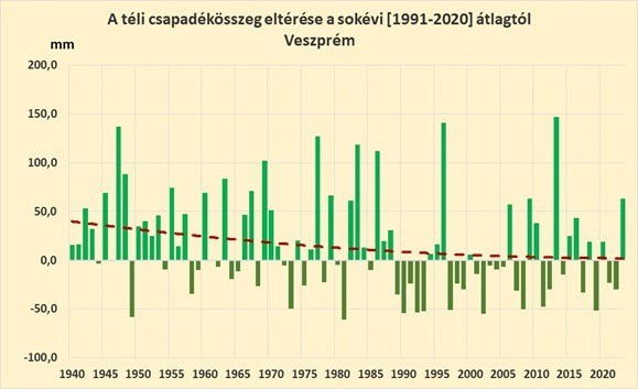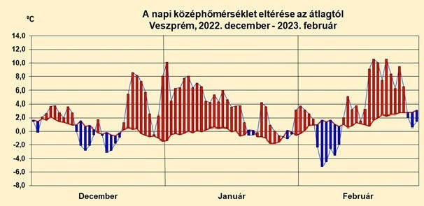 Mindhárom téli hónap melegebb volt az átlagnál. December középhőmérséklete 1,9 C-foknak adódott, ez 1,4 C-fokkal haladta meg a hónapra jellemző értéket. 20-ig a hőmérséklet az átlag körül ingadozott, ezt követően egyre enyhébb légtömegek érték el térségünket. 23-tól a napi maximumok gyakran emelkedtek 10 C-fok fölé és a minimum hőmérsékletek sem csökkentek fagypont alá. Különös enyheség jellemezte a karácsonyi időszakot, a három nap (24.; 25. és 26.) középhőmérséklete 8,1 C-foknak adódott, ilyen meleg karácsonyt korábban nem jegyeztünk fel Veszprémben. December legmelegebb napja 31-e volt 13,7 C-fokos csúcshőmérséklettel. (Az abszolút csúcsot 2021. december 31. tartja 16,2 C-fokos értékkel.) Decemberben 17 napon fagyott és négy napon nem emelkedett a hőmérséklet fagypont fölé. A leghidegebb decemberi napon, 18-án mínusz 7,4 C-fokig csökkent a hőmérséklet.