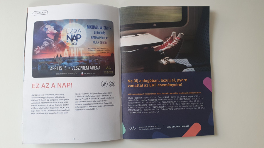 Ezek mellett még további olyan hasznos tudnivalók is szerepelnek a füzetben, mint a kedvezményes, 2023 forintos vonatjegyekről szóló tájékoztató, vagy éppen az EKF hivatalos applikációjának a letöltési linkje, ahol különösebben böngészni sem kell a programlistát, néhány szűrő beállításával témakörönként és helyszínek szerint is lehet keresgélni.