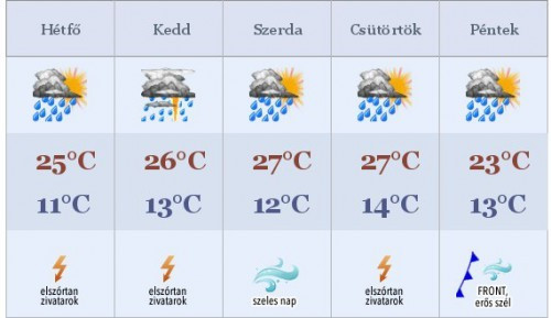 Hétfőn reggel változóan felhős égre ébredhetünk, majd napközben inkább keleten, északkeleten valószínű zivatar, másutt futózáporok kialakulása valószínű. Az északnyugati szél északon és a zivatarok környékén megélénkülhet. Hajnalban 9-14°C, napközben 21-26°C valószínű. Az éjszakai órákban az északi, és keleti tájakon lehet esőre, záporesőre számítani, majd a reggeli órákra nagyrészt megszűnik a csapadék, keleten lehet még kisebb mennyiségre készülni. A szél északon élénk lesz. A hajnali órákban 10-15°C-ig hűl a levegő.