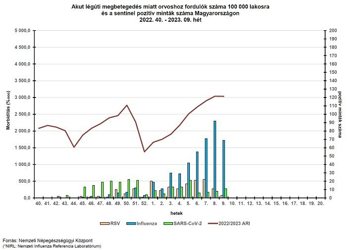 A légúti figyelőszolgálat 24 kórházának adatai alapján a 9. naptári héten kezelésre 329 embert vettek fel súlyos, akut légúti fertőzés (SARI) miatt. A kórházi ápolást igénylő betegek közül 75-nél az influenza, 55-nél a Covid–19 vírusa, 46-nál az RSV állt a megbetegedések hátterében.