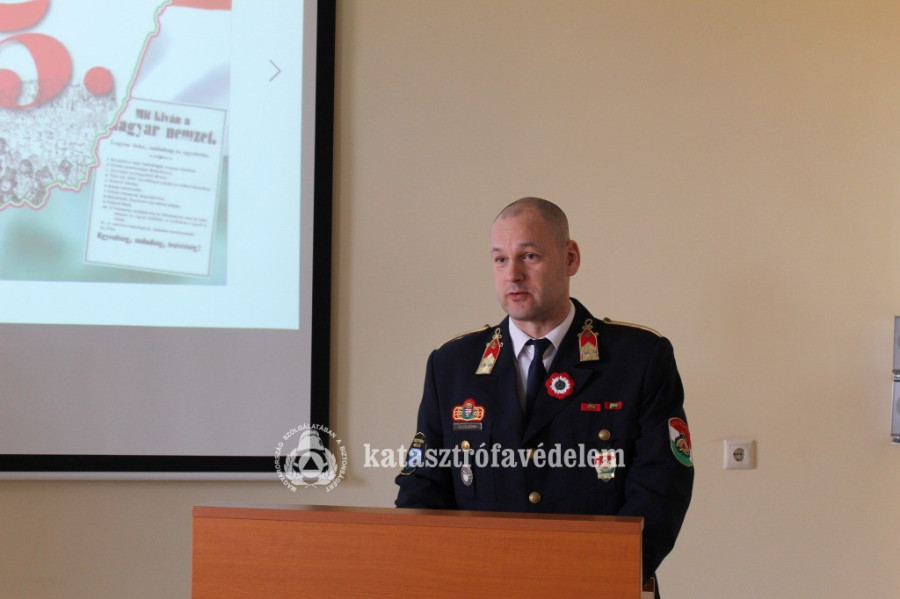 Az ünnepi beszédet megelőzően Dányi Béla tűzoltó dandártábornok, igazgató köszöntötte az állománygyűlés résztvevőit, majd átadta a szót Rauch József tűzoltó alezredesnek, a Veszprémi Katasztrófavédelmi Kirendeltség vezetőjének.