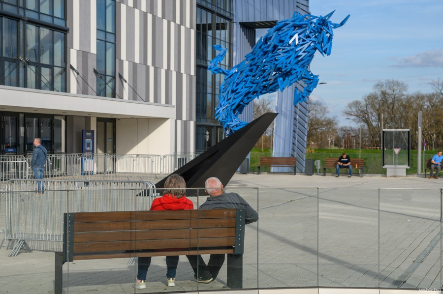 Délután tizenöt órát írtunk, amikor kikanyarodtunk a Tisza-partra. A messzeségből egyik pillanatról a másikra feltűnt egy kék erődítmény, a 2021-ben átadott Pick Aréna külseje is olyan borítást kapott, amelyet megirigyelhetnek a kézilabdabarátok. A létesítmény előtt a csapat „kabalája”, a bika csakugyan kék köntösben várta a szurkolókat, akiknek a napsütésben még árnyékkal is szolgált.