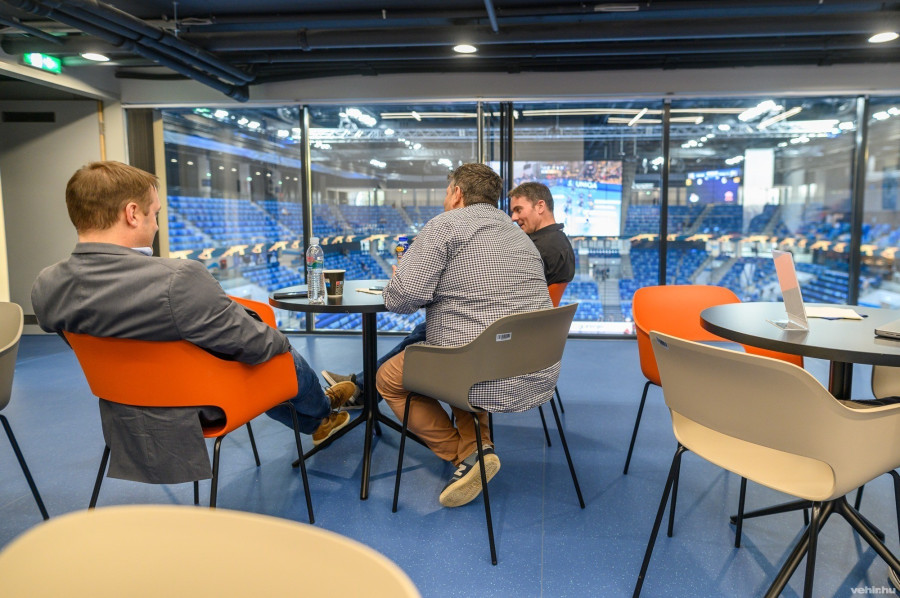 A liftbe lépve azonnal a harmadik emeleten találtunk magunkat, ahol az újságírók számára külön sajtótribün áll rendelkezésre. Már a mérkőzés előtt órákkal üdítőkkel és süteményekkel várták a fotósokat, újságírókat. Erről a hozzáállásról már más kollégáktól hallottam; megsüvegelendő lenne más csapatok részéről is az országban. A szó szoros értelmében megbecsülve érezhettük magunkat.
