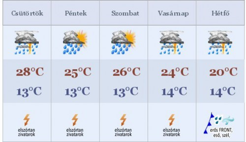 Csütörtökön reggelre az ország nagy részén változón felhős időre számíthatunk, az északi és északnyugati határszél közelében eső, gyenge zápor is kialakulhat. Napközben északon többfelé, másutt csak elszórtan lehetnek zivatarok , melyeket helyenként jégeső, felhőszakadás is kísérhet. A délnyugati szelet eleinte délen kísérhetik élénk széllökések, a nap második felére azonban mérséklődni fog a légmozgás. A hajnali órákban 11-15°C-ig hül a levegő, a legmagasabb nappali hőmérsékletek 23-29°C között várhatóak.