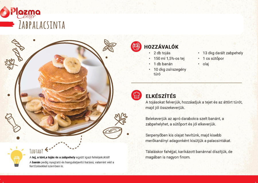 Természetesen a finomságoktól sem kell lemondani. Plazmaadásra készülve, vagy a mindennapi egészséges életmód részeként a zab az egyik legjobb alapanyag, amivel a zabkásán túl még rengeteg ételt készíthetünk, mint például palacsintát.