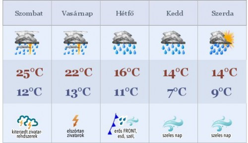 Szombaton reggel délnyugat felől erősen megnövekszik a fátyolfelhőzet. Napközben többfelé számíthatunk majd zivatarokra, melyeket felhőszakadás, jégeső, viharos szél is kísérhet. A légmozgás csak északnyugaton és a Tiszántúlon élénkülhet meg, a legalacsonyabb hőmérsékletek 10-15 fok, míg a maximumok 21 és 26°C körül alakulnak majd. Vasárnap reggel változóan felhős, nyugodt, szélcsendes időre van kilátás, kisebb zápor északkeleten fordulhat csak elő. A legalacsonyabb hőmérsékletek 10 és 14°C között várhatóak.