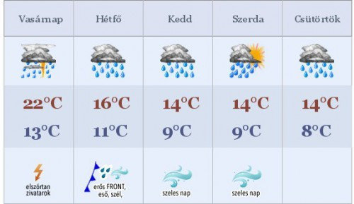 A hét első felében hűvös, csapadékos, szeles idő vár ránk, a nappali maximumok nem érik el a 20°C-ot sem. Ebben az időszakban, de főleg kedden jelentős mennyiségű csapadékra és várhatóan erős szélre van nagy esély.