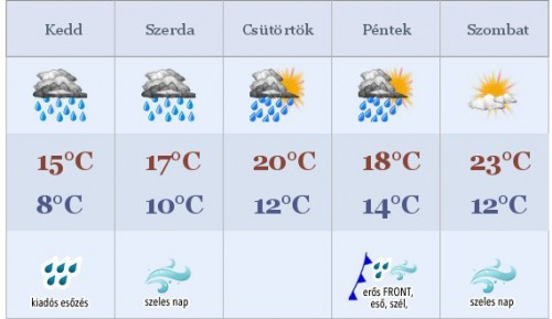 Kedden folytatódik a borongós, országszerte csapadékos idő, a megerősödő - a Dunántúlon viharossá fokozódó - északnyugati szél mellett 7-12°C közötti minimumokra, napközben is csak 10-15°C körüli maximumokra van kilátás.