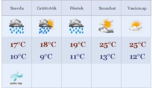 Országos átlagban pár fokot emelkedik a hőmérséklet, 13 és 17°C körül alakulnak majd a csúcshőmérsékletek. Csütörtökön reggel még többbfelé lehet kisebb szitálás, gyenge eső, majd fokozatosan megszűnik a csapadéktevékenység, de továbbra is borult marad az égbolt. A minimumok 7 és 12°C között várhatóak, a légmozgás gyenge vagy mérsékelt marad.