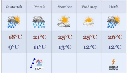 Péntekre virradóra egy hidegfront éri el az ország északnyugati,nyugati részét, így ott záporeső, és megélénkülő északnyugati szél várható, másutt változóan felhős ég valószínű. A minimumok 6-12°C között alakulnak majd.