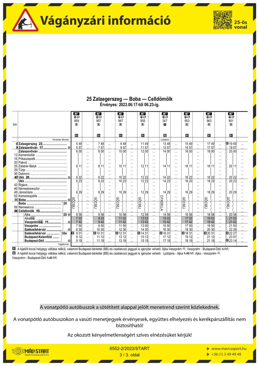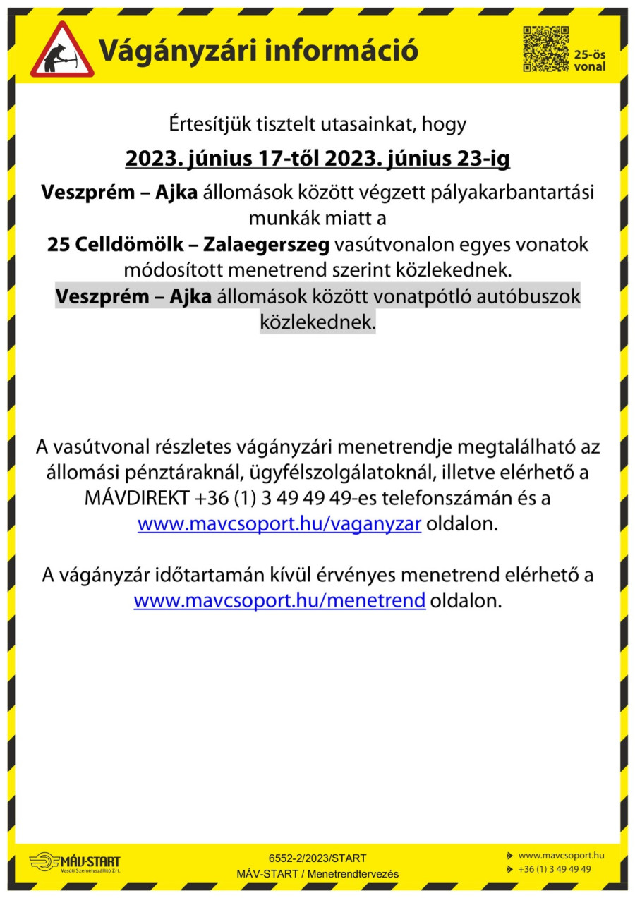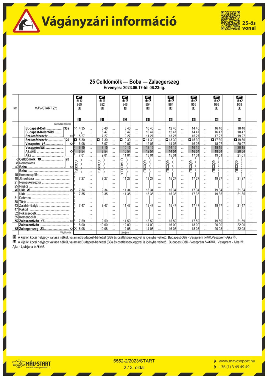 A vasútvonal részletes vágányzári menetrendje megtalálható az állomási pénztáraknál, ügyfélszolgálatoknál, illetve elérhető a MÁVDIREKT +36 (1) 3 49 49 49-es telefonszámán és a www.mavcsoport.hu/vaganyzar oldalon.
