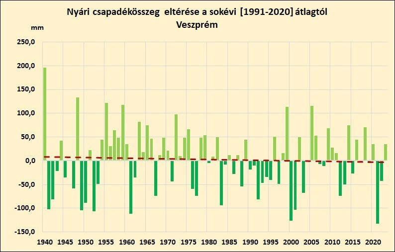 A csapadékos tél és tavasz után az idei nyarat is a bőséges csapadékhullás jellemezte. 33 csapadékos napból 18 volt zivataros, de a szélsőséges időjárást okozó zivatarfelhők elkerülték térségünket. A három nyári hónap csapadékösszege 236 milliméternek adódott, ez 35,5 milliméterrel haladja meg a sokévi átlagot. Júniusban 65,6 milliméter esett, ez a sokévi átlaggal megegyező mennyiség, júliusban 73,8 milliméter, 13 százalékkal több az átlagnál. Augusztus csapadékösszege 96,5 millimáternek adódott, 42 százalékkal több az időszakra jellemzőnél. A legtöbb 24 órás csapadékot augusztus 28-án jegyeztük fel, ekkor 29,3 milliméter eső esett zivatar kíséretében. Érdemes megjegyezni, hogy a vármegye nyugati területei jóval több csapadékot kaptak, mint Veszprém térsége.