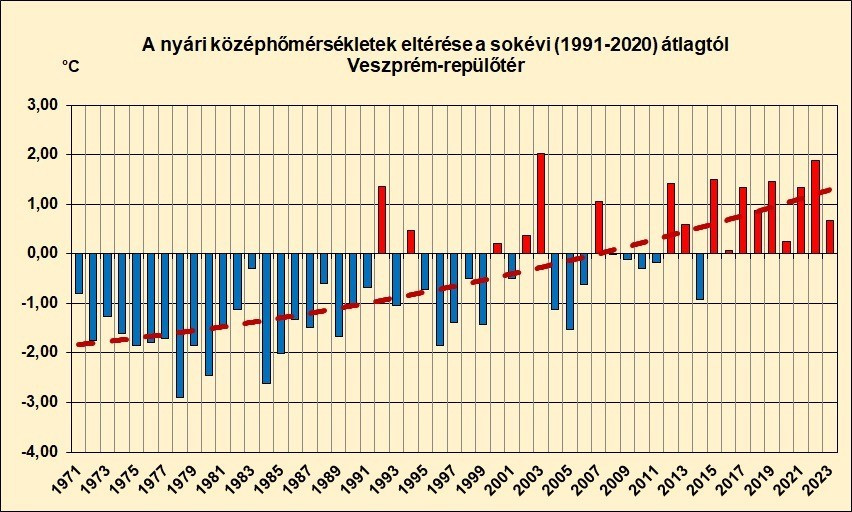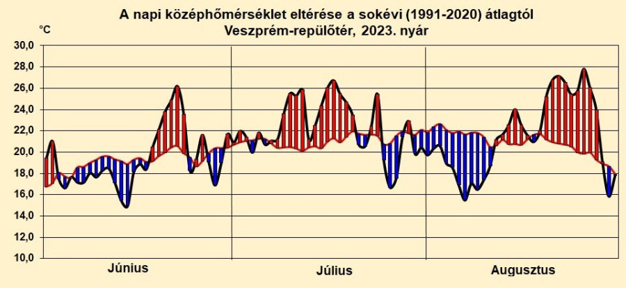 Az évszak középhőmérséklete 21,03 C-foknak adódott (az 1991-2020-as átlag 20,37 C-fok), így tovább folytatódott az átlagnál melegebb nyarak sorozata. Legutóbb térségünkben a 2014-es nyár hőmérséklete maradt el az átlagtól, akkor közel 1 C-fokkal volt hűvösebb az időszakra jellemzőnél. Az idei június 0,2 C-fokkal, a július 1,2 C-fokkal, az augusztus 0,6 C-fokkal lett melegebb a sokévi átlagnál. Július a 11. legmelegebb hónapnak bizonyult a repülőtéri adatsorban.