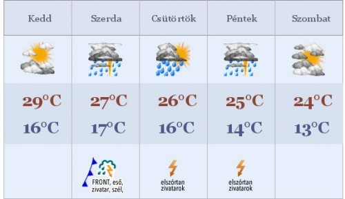 Nyugodt idő várható kedden, estétől azonban nyugaton megvastagodhat a felhőzet, így itt lehetnek újra záporok. Gyenge szél mellett hajnalban 12-17°C-ig hűl a levegő, napközben 26-31°C körül alakulnak majd a legmagasabb hőmérsékletek. Szerdára nyugat, délnyugat felől egy mediterrán ciklonnak köszönhetően nagy nedvességtartalmú levegő áramlik a térségünkbe, reggel eleinte délen, majd a nap folyamán nyugaton és északon, északkeleten várható eső, záporeső, délen zivatar is. Főként a Dunántúlon nagy mennyiségű esőre van kilátás. Mérsékelt szél mellett hajnalban 14-19°C-ig hűl a levegő.
