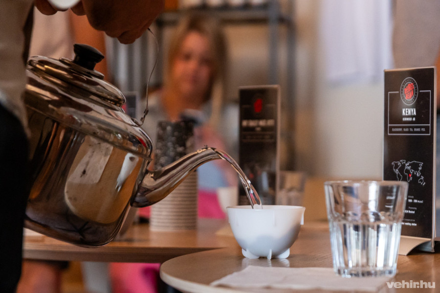 Három-négy perc elteltével végre elérkeztünk a tényleges kóstolás pillanatához. Előbb Denis még gondosan lefölözte a habot a folyadék tetejéről, és erről is elárult néhány érdekességet. A kávé tetején képződő hab ugyanis – amit az eszpresszóról is jól ismerhetünk – a kávé szén-dioxid tartalma miatt keletkezik, és sokat elárul a bab frissességéről. A pörkölt kávébab két-három hét alatt szabadul meg a szén-dioxid nagyjától, ebben az időszakban a gáz savas hatást, savanykást ízt kölcsönöz neki.