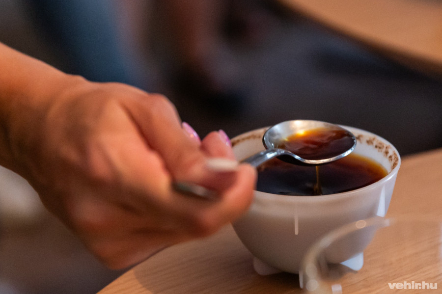 Az ily módon előkészített kávét kanalakkal kóstoltuk, ügyelve arra, hogy a csésze aljára leülepedett kávét ne kavarjuk fel. Denis tanácsára szürcsölve fogyasztottuk az italt, hogy a beszippantott folyadék rendesen összekeveredjen a levegővel, ezáltal ugyanis az ízlelésben az orrunkban található receptorok is aktívabban részt vesznek, ráadásul a szürcsölés révén a szánkban is jobban szétporlad az ital, nagyobb felületen érezzük az ízét, és így tisztábban kirajzolódnak az adott kávé karakterjegyei.