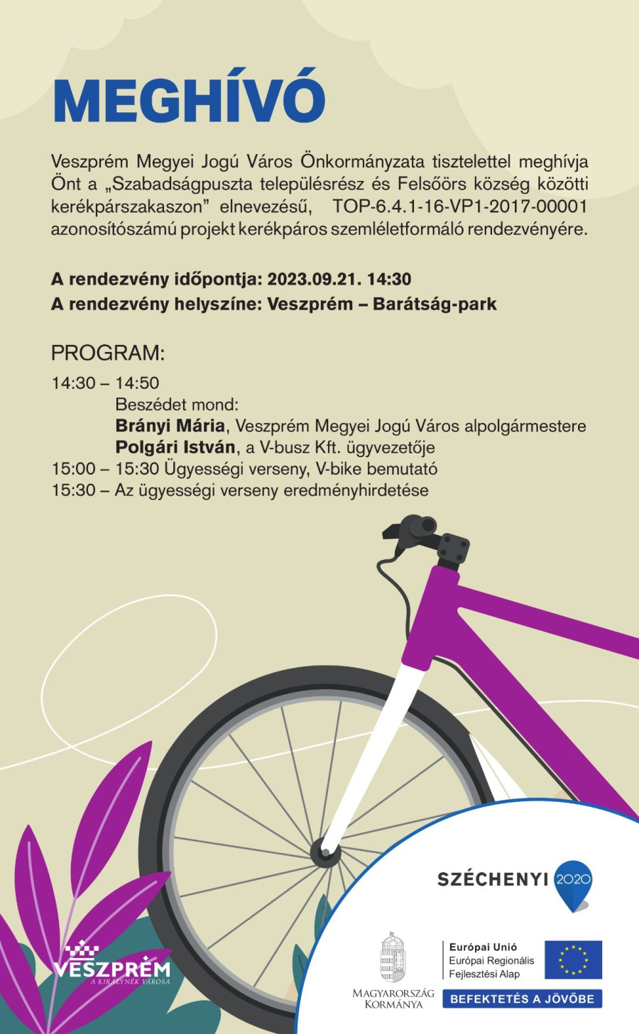 A pályázat részeként Veszprém önkormányzata a Barátság-parkba hívja a város iskolásait, a Kossuth Lajos Általános Iskola és a Báthory István Általános Iskola diákjait, 2023 szeptember 21-én,délután 14 óra 30 perctől, hogy részt vegyenek a kerékpáros szemléletformáló rendezvényen, melynek keretében biciklis ügyességi versenyt és V-bike bemutatót is szerveznek.