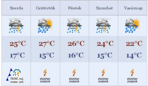 Szerdára nyugat, délnyugat felől egy mediterrán ciklonnak köszönhetően nagy nedvességtartalmú levegő áramlik a térségünkbe, reggel eleinte délen, majd a nap folyamán nyugaton és északon, később keleten várható eső, záporeső, a Dunántúlon zivatar is. Helyenként nagyobb mennyiségű esőre van kilátás.