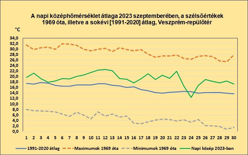 A napi középhőmérséklet 2023 szeptemberében egy nap kivételével (szeptember 24-én a napi közép 12,4 C-foknak adódott) meghaladta a sokévi átlagot, 12 napon a pozitív eltérés több volt, mint 4 C-fok. 12-én a napi középhőmérséklet 0,1 C-fokkal maradt el a 2016. szeptember 12-én mért értéktől, 22-én pedig megdőlt a napi középhőmérsékleti rekord, ami 21,9 C-foknak adódott. A korábbi rekordot 1985. szeptember 22-én jegyeztük fel 21,7 C-fokkal.