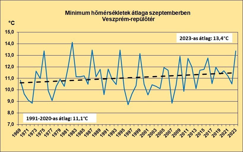 A napi minimum hőmérsékletek alapján is nagyon melegnek bizonyult 2023 szeptembere, 2,3 C-fokkal melegebb a sokévi átlagnál. Sorrendben a negyedik hónap az adatsorban, 0,7 C-fokkal maradt el a „csúcstartó 1982-es év szeptemberétől. 10 C-fok alatti minimum hőmérséklet nem volt, a leghűvösebb reggelt 28-án jegyezték fel 10,9 C-fokos értékkel, míg a legenyhébb reggel 3-án volt, ekkor 16,2 C-fokot mutatott a hőmérő.
