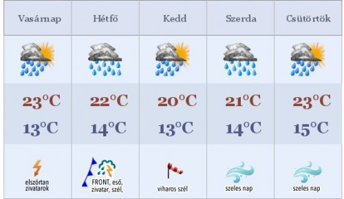 A nap folyamán országszerte várható záporeső, eleinte nyugaton, majd keletre is sokfelé zivatarral kell számolni. Délen, délkeleten heves zivatarok, jégeső, felhőszakadás, viharos szél is lehetséges.