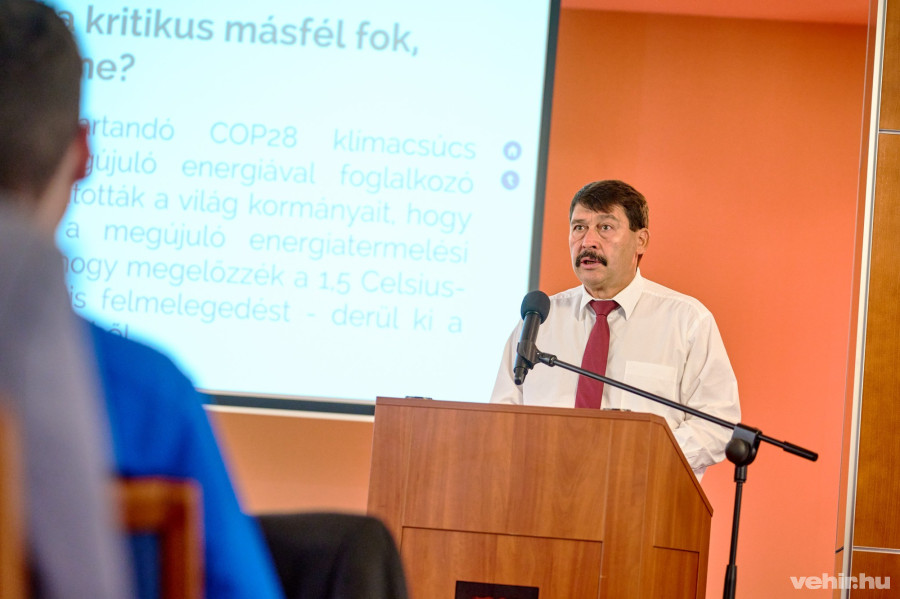 A rektor után Áder János állt a közönség elé. Ő még mielőtt belement volna előadásának részleteibe, egy friss hírrel indított, miszerint a COP28 klímacsúcs előkészítését végző elnökség kiadott egy közleményt, hogy 2030-ra minden országnak meg kell négyszereznie a megújuló energia kitermelési kapacitását. A volt köztársasági elnök szerint ez egyszerűen irreális és teljesen szakmaiatlan, mégis a közönség tapsol az ilyen kijelentéseknek.